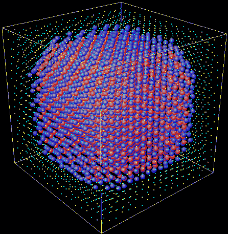 You should be able to see that there is a preponderance of blue cells around the majority of the external surfaces - suggesting that this was the colour of the cells in the domain of the last rule applied. To summarise the result, there is an exactly equivalent "1- step" automaton with the domain illustrated above corresponding to Fredkin's example "6-step" automaton. While the domain is not an exact cube, it should be clear that it has cubic symmetry - and not the higher level of symmetry associated with FCC structures. I note that neither cubic nor FCC structures are typically sufficiently symmetric for gasses based on then to obey the Navier-Stokes equation - or exhibit isotropy on a macroscopic scale. Having spatial isotropy arise naturally from the geometry is not be a necessary property for a model of nature to have. However, spatial symmetry would almost certainly be useful - and might even be important. I don't consider its absence to be an aesthetically pleasing aspect of the model.